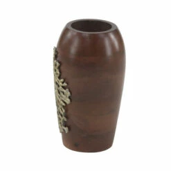 10″ x 6″ Coastal vase crafted from mango wood, features a brown-finished tapered body with a round mouth and a round base, features a gold-finished embossed coral design on the body