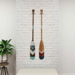 - This oar wall decor features two brown wood pieces with blue, white, and red paint accents