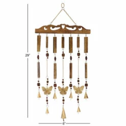 Handmade in India, this decorative gold windchime brings both earthy and metallic materials together for a whimsical piece of accent decor. The top of the wind chime features a large piece of natural golden brown wood with acanthus and heart carvings, held by a metallic gold chain that attaches to the hanging loop at the top. Suspended beneath the heart and acanthus wood are golden brown wood blocks, dark reddish-brown and ivory wood beads, gold metal butterflies, and gold metal bells in a staggered pattern. This item comes shipped in one carton. Item features metal ring for easy and secure hang. Suitable for indoor use. Made in India. Coastal design.