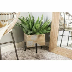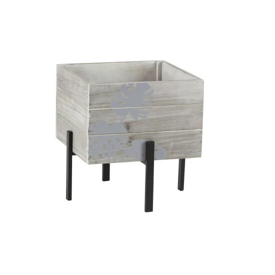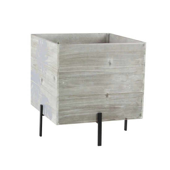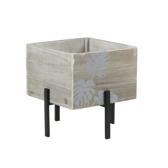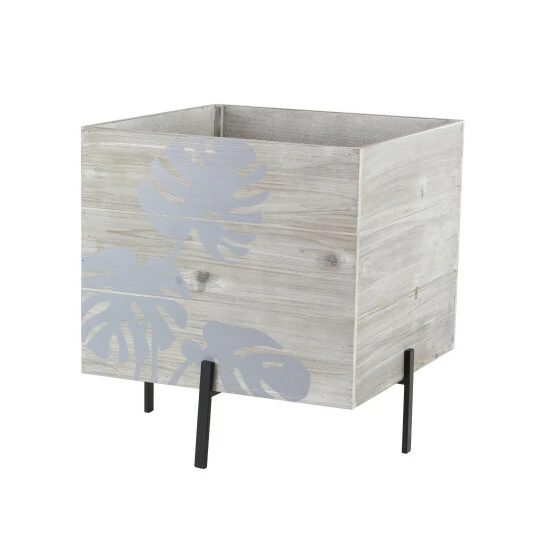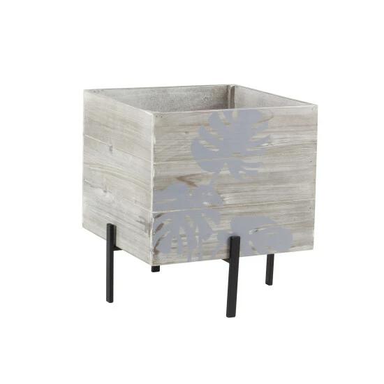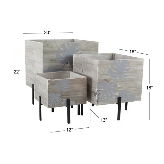 This set of rustic square planters is the perfect solution to showcase your garden greenery. Made out of mixed Chinese fir wood, plywood and iron materials, it features three natural brown-finished, cube-shaped pots with gray-finished palm leaf accents. Each planter is supported by four black-finished bar legs. Designed with wide and deep settings, these pieces can surely accommodate most types of plants.