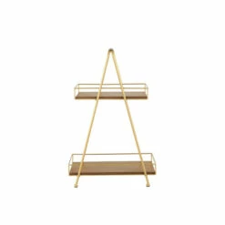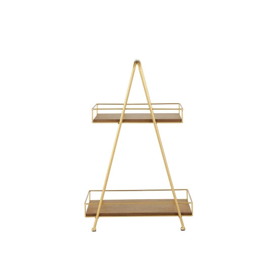 - 2-Tier tray with a metallic gold finish over the iron frame, rectangular trays crafted from warm, textural brown Chinese red pine and rubber woods