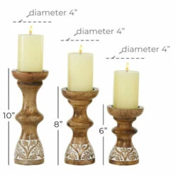 This charming set of wooden candlestick holders will complement any traditional- or farmhouse-style decorating scheme. Made in India, each holder is made of solid mango wood and features an elegant design at the base. The holders vary in height. When set side by side, they create a uniform look. You can also place each candle in a different area of the room to light up multiple corners. Each pillar candle holder can accommodate 1 votive or pillar candle. This item comes shipped in 1 carton. Suitable for indoor use only. Made in India. This set includes 3 candle holder. Country Cottage vibe.