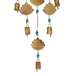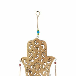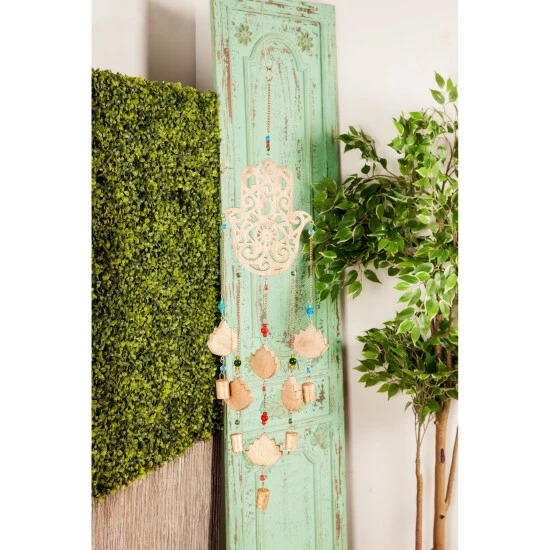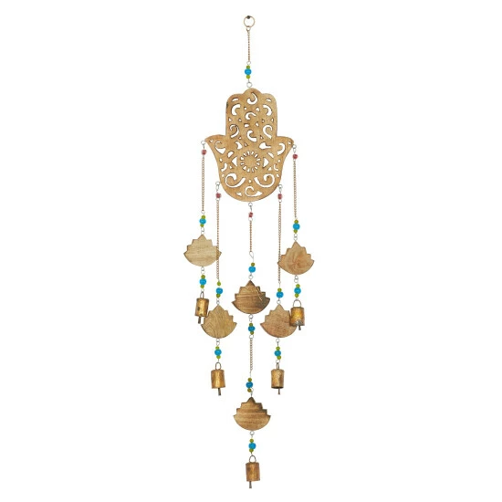 Brighten up your patio, lawn, or garden with this wood and metal wind chime. Nature’s own music sounds best when accompanied by the gentle tones of this outdoor accent piece that features a hamsa-inspired design with cut-out ornate pattern, leaf figures in brown finish, and cylindrical gold wind catchers. Add a twist to your natural or eclectic themed home by using this accent decor that will surely create a delightful accessory for your outdoor space. This wind chime will extend a warm welcome to all your guests and can also make a great housewarming gift. This item comes shipped in one carton. Item features metal loop for easy and secure hang. Suitable for indoor use. Made in India. Eclectic theme.