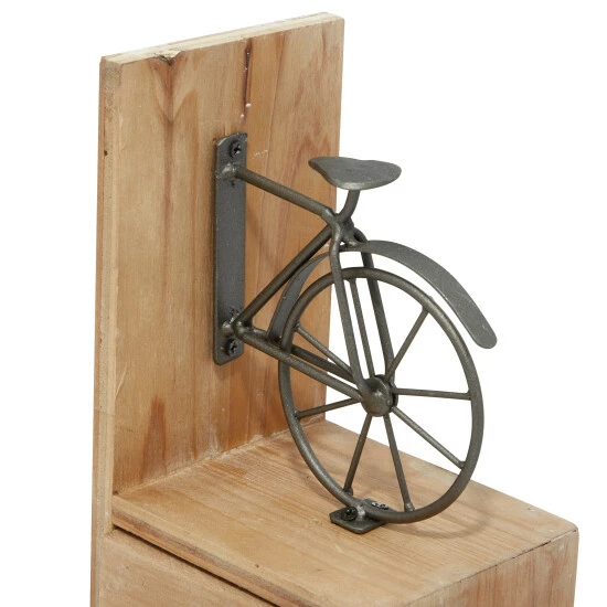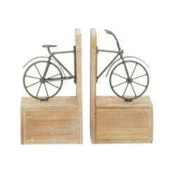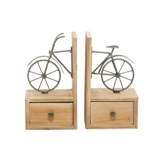 Get the ultimate in style and multi-function with this set of metal bicycle and wood drawer bookends. A silver metal bicycle sculpture in split down the middle and secured to a 90-degree angle fir wood bookend. Each wooden bookend features a small drawer with a metal pull handle. The neutral light wood tones and silver metal finishes work with any color palette. This item comes shipped in 1 carton. This set of bookends features 2 built-in drawers. Suitable for indoor use only. This set includes of 2 bookends. Farmhouse-themed style.