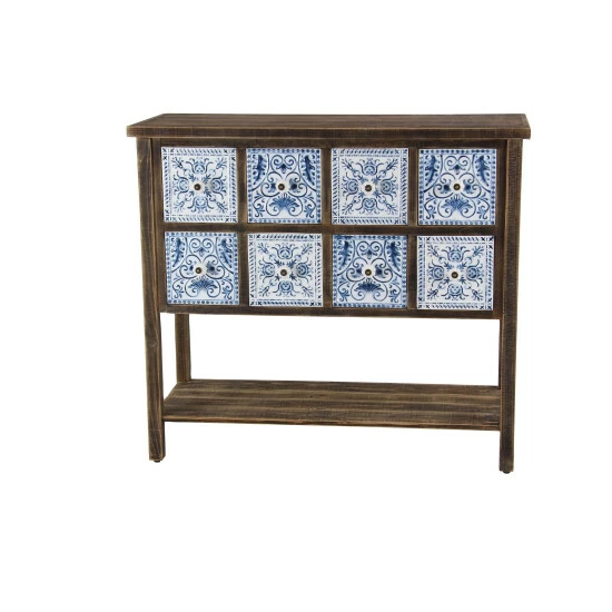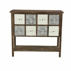- This farmhouse style inspired wood and metal cabinet drawer features 8 drawers with elaborate door designs fixed with a stylish flower knob at the center of each drawer door