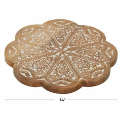 - This farmhouse style inspired design brown wood lazy Susan cake stand features a octa-curve outline with intricate engravings of flowers and leaves on its surface