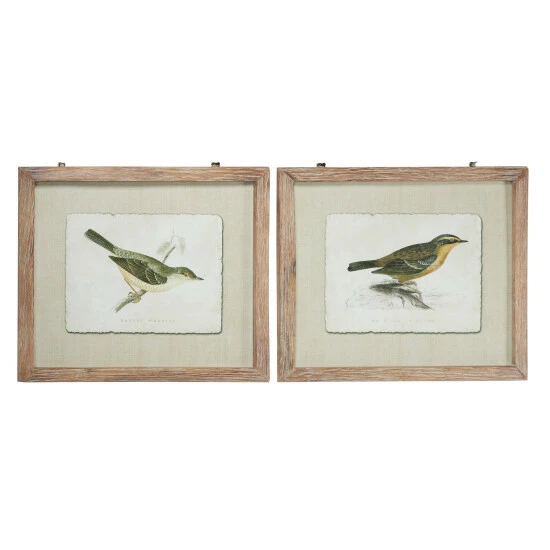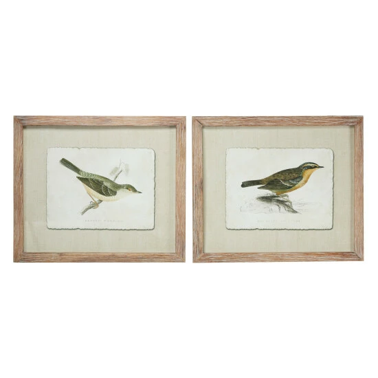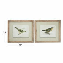 Add vintage and farmhouse charm to your home with these framed vintage-inspired bird art prints. Antique white canvas backgrounds lay beneath the white paper with realistically-drawn birds illustrated with muted black, brown, green, and gold tones. The set of 2 includes a barred warbler bird and a mountain accentor bird, both posed in botanical settings. Each bird print is placed in a whitewashed light wood frame. Sawtooth hangers on the back for fast and easy hanging. Suitable for indoor use only. This set includes 2 bird frame art. This item comes shipped in one carton.