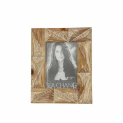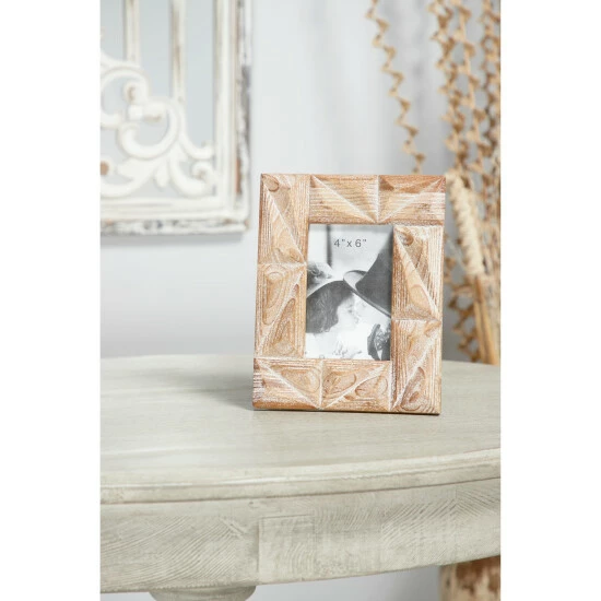 Wrap a treasured memory or favorite art print in natural, earthy style with this rectangular natural wood picture frame that houses any 4″ x 6″ print. The natural wood grain complements rustic and natural style spaces while the unique, geometric shapes carved into the wood create a modern, dimensional edge. The natural beige, mocha brown, and golden brown hues swirl throughout the wood grain, adding an earthy vibe to this accent decor while working with any color palette. All natural wood means exact wood grain patterns and hues may vary, making this wood photo frame table décor one a kind. . Ships in 1 carton. Easel stand backing with secure hardware for stability. Suitable for indoor use only. Photo frame can hold 1 picture with 5″x 7″ frame opening. Farmhouse-themed style.