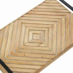 Stylize your dining experience with this farmhouse brown wooden serving tray set with ribbed design and iron handles. Each rectangular tray is crafted from wood and highlights diagonal ribbed patterns with natural brown finish and 2 conveniently placed iron handles. Use as individual or set serving trays or as decor of holders for your coffee, console, and kitchen tables, these decorative wooden trays are sure to make a charming statement in your farmhouse-themed home. Please note that this item is for decorative purpose use only and are not food safe. This item ships in one carton. Designed with a farmhouse style for that homey feeling. Made of wood and metal. Natural wood trays with black handles on each end. Furnished with 2 metal handles. Set of 2 that measures 19″L x 12″W x 3″H and 16″L x 10″W x 3″H and weighs 4 lbs