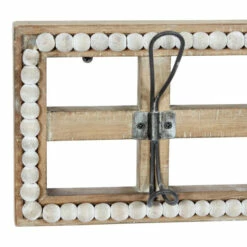 The vintage appeal of this traditional style brown wood and metal wall hook will liven up your living space. This rectangular wood and metal wall hook features a wooden frame with distressed white finished wooden beads that complement the natural brown tone of the primary wood frame. The slats runs horizontally along the middle of the rectangular frame and is supported by 4 shorter wooden slats running vertically. The 4 metal hooks are fastened to the intersections of the wood slats with 2 screws using a metal plate. Your traditional style home will see style and function improvements mounted this on any wall of your home. Hardware on the back allows for easy hanging. This item comes shipped in one carton.