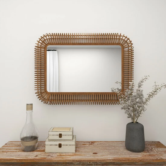 The purpose of a wall mirror, apart from home decoration, is to bounce back outdoor light to a small room to create the illusion of space. Specifically, this rectangular rattan-framed mirror complements narrow entryways, small farmhouse themed bedrooms, cream-themed hallways, and transitional spaces between rooms. Despite the seemingly light frame, durable materials were used to create it. This is to maintain an elegant natural feel on product design. This horizontally or vertically hanging mirror hangs via metal backings. Suitable for indoor use only. This item comes shipped in one carton.