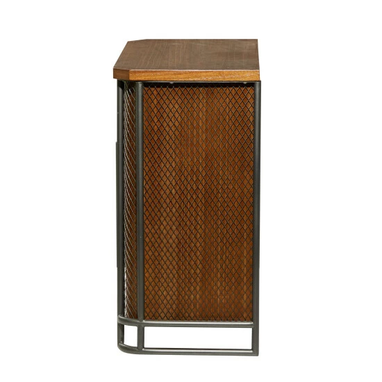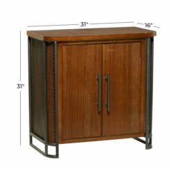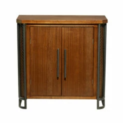 - Impress your guests with this 2-door decorative cabinet that flaunts a unique design and sturdy metal base