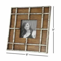 Display your treasured memories of loved ones and past events with this decorative photo stand. The stand features an iron frame that forms a grid-like design on a fir wood back. The iron has a distressed finish, while the wood has a warm natural finish. A glass window in the center of the stand offers enough space for a 4″ x 4″ photo. Use the stand to complement an industrial- or rustic-inspired bedroom, study, or living room. Ships in 1 carton. Suitable for indoor use only. Photo frame can hold 1 picture with 4″x 4″ frame opening. Designed with an industrial theme.