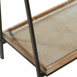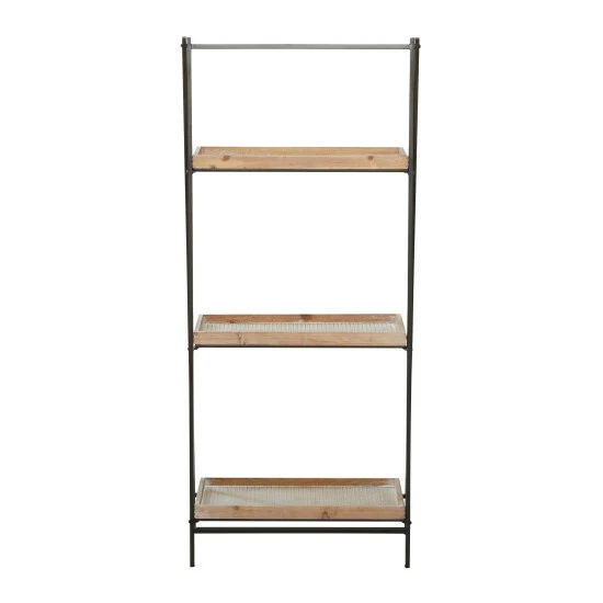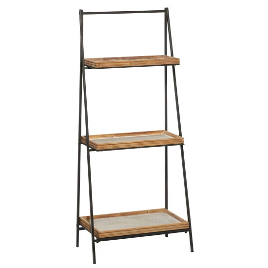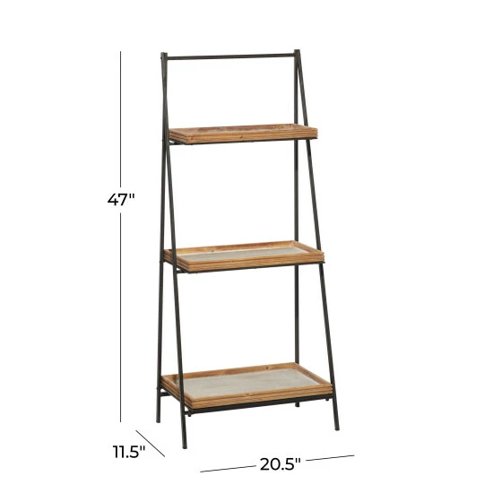 This metal shelf features a slender black exterior and a letter A silhouette, making it a suitable addition to elegant contemporary-themed living rooms, offices, dining areas, and bedrooms. The center point of the design, however, is on the three tiers of tray-like wooden shelves that can hold coffee table books, organizer chests, small indoor potted plants, flower vases, trophies, and picture frames. Product dimensions are 21″L X 12″W X 47″H.