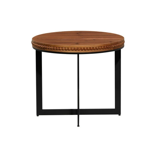 Your eclectic inspired living space will not be complete without this eclectic style round brown wood and metal beaded coffee table. This wood and metal combination coffee table features a stunning natural brown wood finish on the surface material. This round table also features wooden beaded details around its edges. The entire structure rests on 4 metal legs reinforced by 2 metal bars placed diagonally forming an ex along the base of the legs. This coffee table will look excellent in your living rooms together with other decor of the same theme. Designed with rubber stoppers at the base that prevent scratching as well as sliding around. This item comes shipped in 1 carton. Suitable for indoor use only. Maximum weight limit is 100 lbs. Designed with an industrial theme.