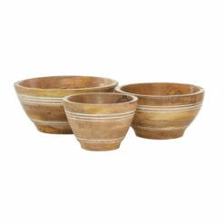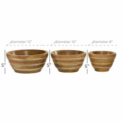Enjoy a meal in this 3-piece mango tree wood bowl set from India. Or, use the items as plant or decor holders. Each item is a nature’s product with a modern character for natural and country interiors. Keep them intact and polished by not exposing them to extreme heat and moisture. Bowls measure 12″W X 5″H, 10″W X 5″H, and 8″W X 5″H, respectively. Cleaning requires hand washing with warm water and soap, then air drying only.