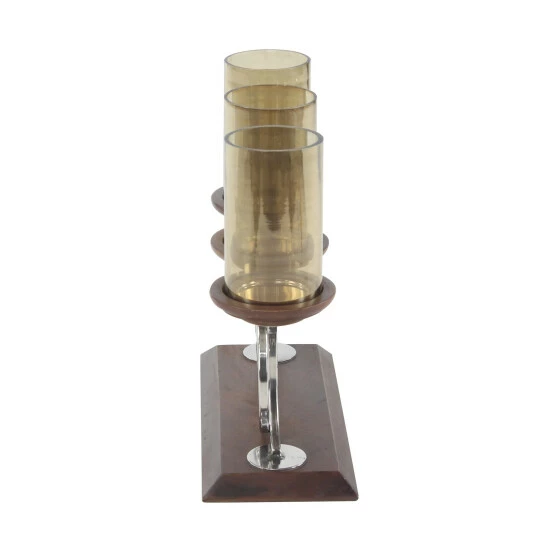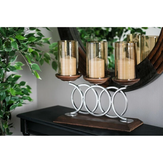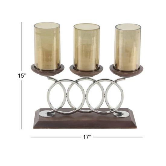Add a dramatic effect to your tabletop or mantle with this three-light candle holder. Made out of mixed mango wood, stainless steel and glass materials, it features three cylindrical candle shades in an iridescent tan finish, supported by a silver-finished, overlapping ring-style post with brown-finished, round bobeches and a brown-finished, rectangular base. Let this lovely piece lighten up your space in style! You can have it now at a price that will surely suit your budget.