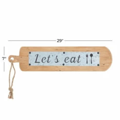 Give your home spaces a rustic yet elegant vibe with this wooden decor sign displayed on your living room or bedroom walls. Create an excellent focal point on your walls paired with some cute accent tables, and level up your home with this amazing wall Decor. Place this on any blank wall space adding both texture and depth to your home. This item comes shipped in one carton. Wooden slat is carved for back frame and riveted with galvanized metal. Suitable for indoor use only. Modern farmhouse design. Showcase “Let’s eat” in cursive typography with spoon and fork icons. Includes hanging hardware for easy hanging.