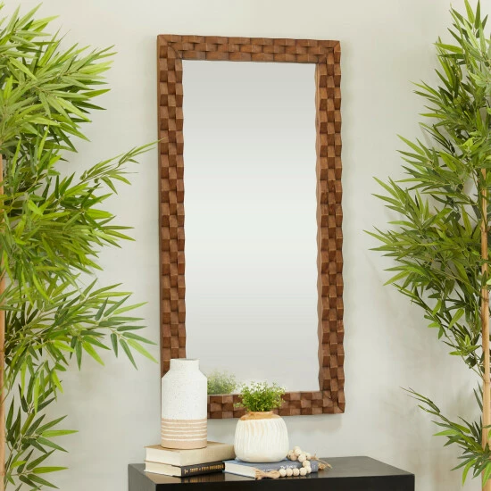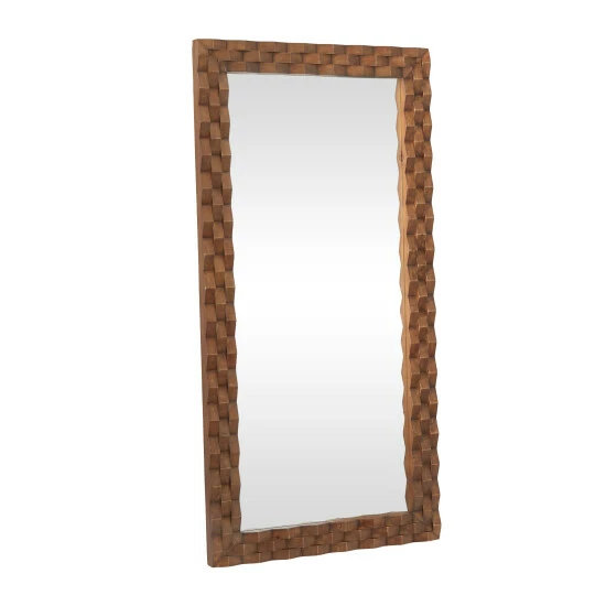 - Geometric carved patterns flaunts the outline of this wooden wall mirror for an embossed and textured frame