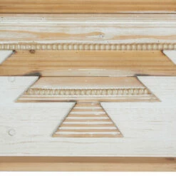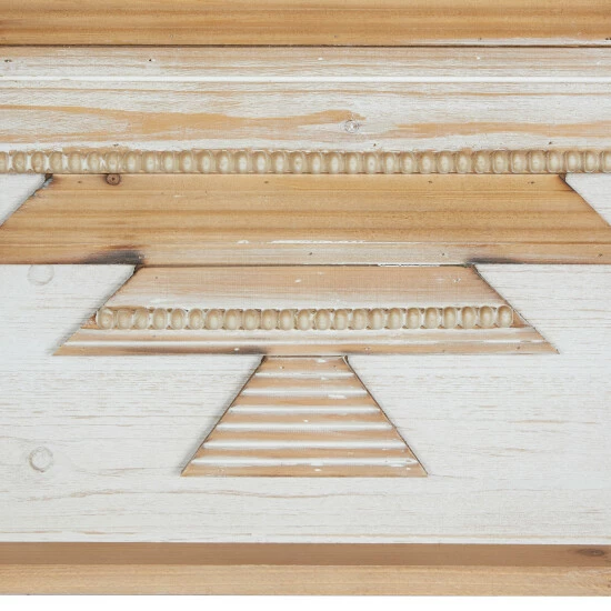 - This slatted wood wall decor features wood cut-outs with linear and bead carvings forming leaf-like structures