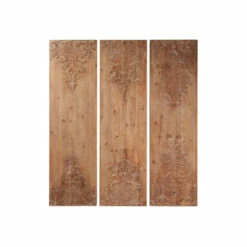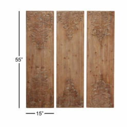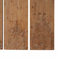 Handcrafted in India from Chinese fir wood, this ornately-carved wood wall decor is comprised of 3 large wood panels, each with hand-carved antique frame, festoon, and acanthus designs at the tops and bases. The natural light and mocha brown hues against the natural wood grain of the Chinese fir wood bring rustic warmth, adding an earthy touch to your space. Easy to hang by D-ring hardware in back. Suitable for indoor use only. This item comes shipped in one carton.