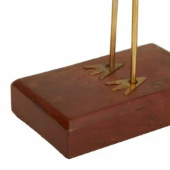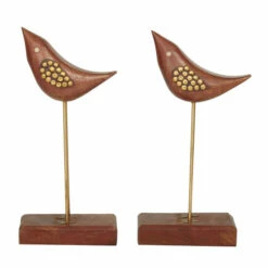 - This set of wood bird sculptures feature a reddish brown wooden body with white eyes, gold jeweled wings and legs