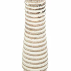 - Candle holders features a matte white washed exterior with horizontal ribbing texture