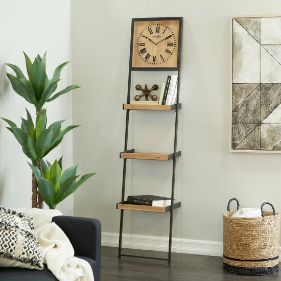 - An analog clock sits atop this leaning ladder shelf adding character to its design