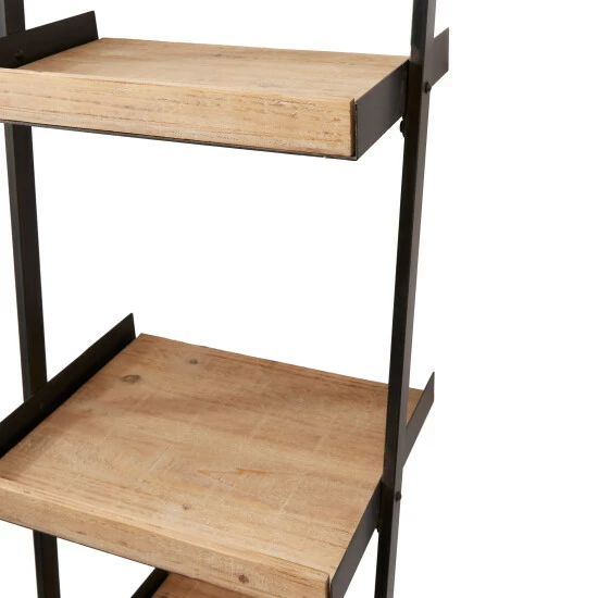 - The natural wood brown finish of this ladder shelf is highlighted with an ebony black frame