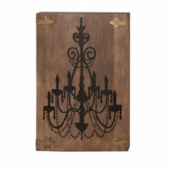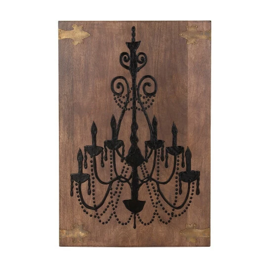 36″ x 24″ Traditional wooden wall art, crafted from mango wood and brass, features a stained brown finish, features a black brass chandelier design, designed with a white frame.