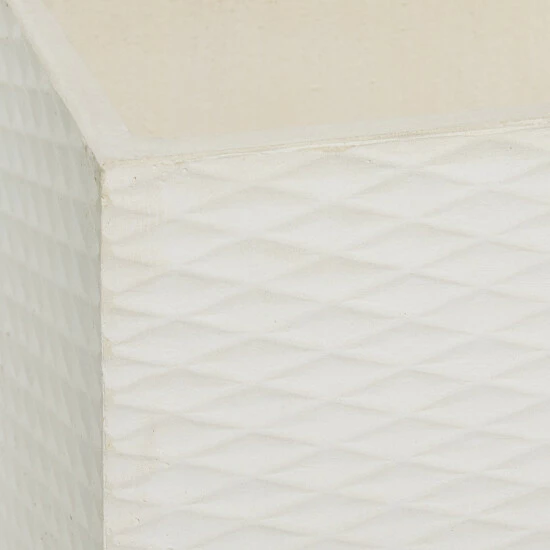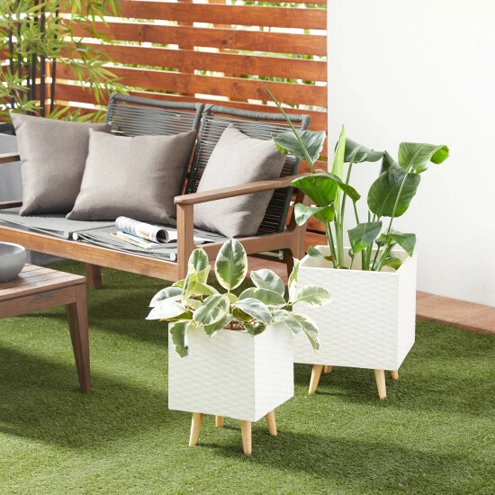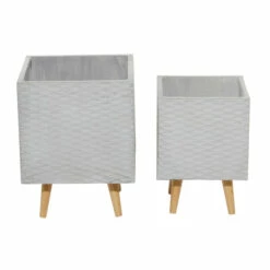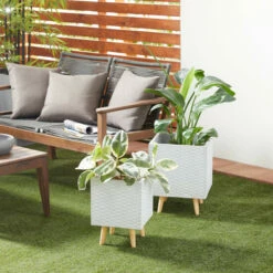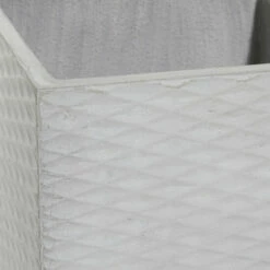 Verdant plants and flowering shrubs provide serene respite in these hectic times. And they need the proper holder to maintain a home’s theme. This set of two planters, crafted from fiber clay with white and grey textured diamond patterns on the square bodies, elevates the look of modern and contemporary-style homes and gardens. Place leafy plants and flowering shrubs to highlight the trendy style of gardens, patios, and indoor/outdoor spaces. Great additions to gardens, patios, and outdoor spaces with a modern and contemporary theme Wipe clean with a dry cloth. Suitable for indoor and outdoor use Pots do not have drainage holes. Set of 2 square fiber clay planters. Contemporary design. This item comes shipped in one carton.