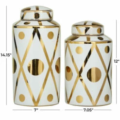 - Set of 2 tall white/gold, black, silver, blue decorative jars with deep setting and wide opening with removable round lids for safe storage