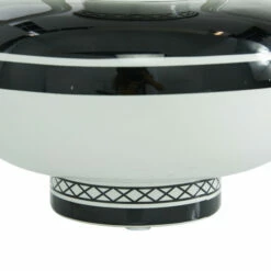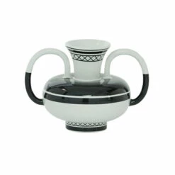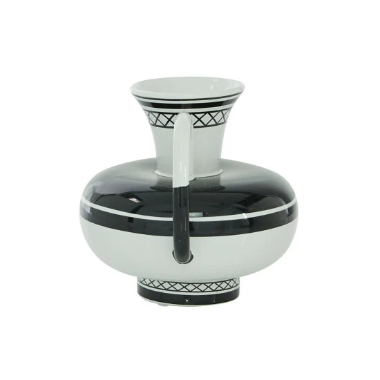 This black and white flower vase with handles was made from dolomite, painted with bold decoration, and given a ceramic finish to suit contemporary and eclectic interiors. It works as a vase, as a décor holder, and as a tabletop exhibit, offering both style and function to such dynamic themes. The vase stands 7″ tall and is best used as a standalone decor or with fake flowers as it does not have drain holes.