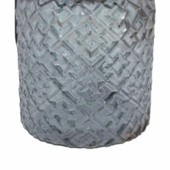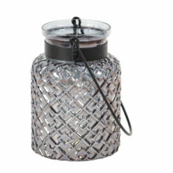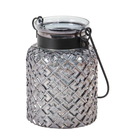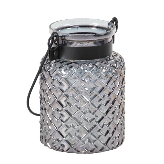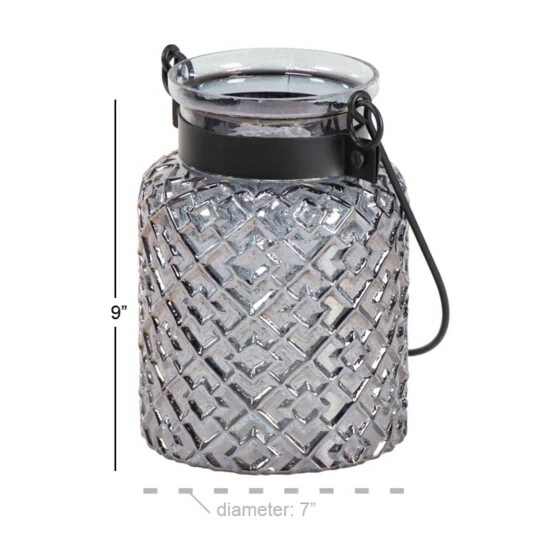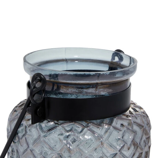 Add instant warmth and inviting ambiance to your home with this stylish textured iron and glass candle lantern. This piece is a great addition to any modern interior and will surely complement your existing home decors. With its cylindrical glass body with geometric pattern and a sturdy metal band and arched handle, this clear and black glass candle lantern works beautifully on any mantel or accent table. Made of glass and iron, this home decor provides solid construction and is perfect for creating an elegant adornment or centerpiece for a festive celebration. Delight your guests and make any occasion extra special by adding a lighted candle to this impressive modern iron and glass candle holder. This item ships in 1 carton. Metal handle at the top for easy hanging. Suitable for indoor use only. Made in India. Designed with an industrial theme. Lantern candle holder which can hold 1 pillar candle.