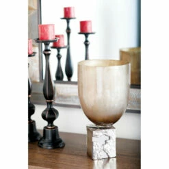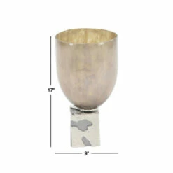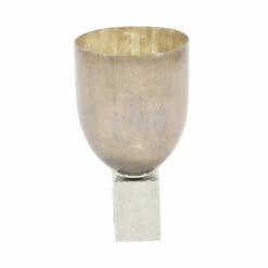 Illuminate your space in style with this hurricane candle holder from Studio 350. Crafted from glass and aluminum materials, it features a gold-finished, cup-style shade supported by a textured silver and gray-finished, rectangular block base. Its shade is designed with a deep setting to protect the candle flame from high winds. Add this to your side table, mantle or console and give your guests something to talk about.