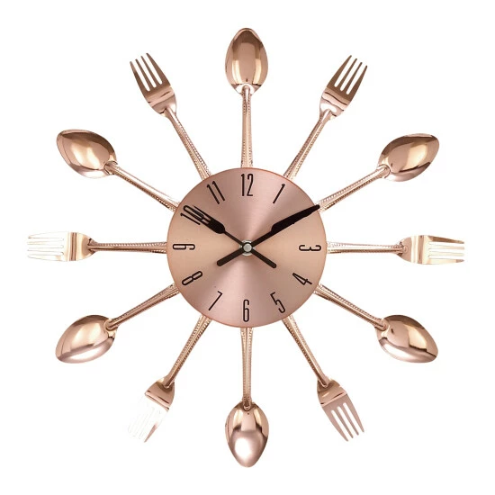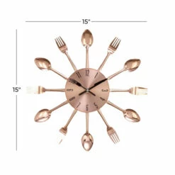 Don’t settle for a basic wall clock to keep you on time! Add this iron wall clock to your space and create a blend of amazing eclectic design. This lovely accent piece provides next level charm and unexpected elegance to your home. It features a metallic copper finish, adorable fork and knife clock hands, and unique utensil-designed frame. Feel free to hang this accent decor piece in your kitchen. Display on wall with other wall decors for a more beautiful and stylish home. Requires 2 AA batteries. Not Included. This item ships in one carton. Features Arabic numerals for the hour markers. The clock mechanism runs silent. Item comes with metal loop for easy and secure hang. Suitable for indoor use only. Eclectic theme.. Eclectic design lets your personality shine in your home. This wall clock are constructed of a solid iron for durable structure. Item features a metallic copper finish. Unique accent decor featuring copper clock face with adorable fork and knife clock hands. Measurements: 15″L x 0.5″W x 15″H; weight: 0.96 lbs