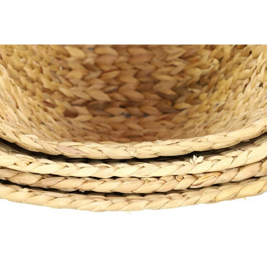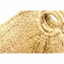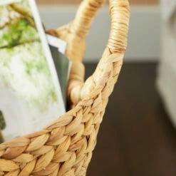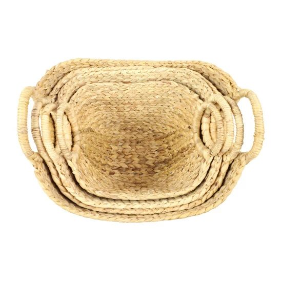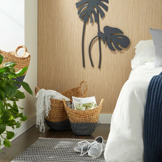 Go green in style with this set of 4 eco-friendly natural water hyacinth wicker storage baskets. Featuring the latest color blocking trend, the baskets’ dip-dyed gray bases create a bold contrast against the light beige braided wicker. The unique oval silhouette and slick, circular handles bring an updated look while the neutral blonde and gray hues will work well with most color palettes. Nest for consolidated storage or line them up for easy access.