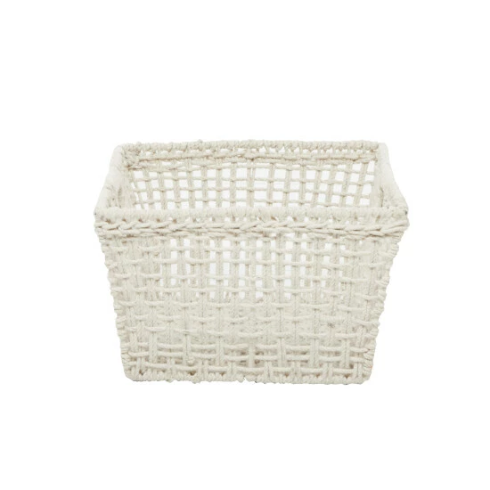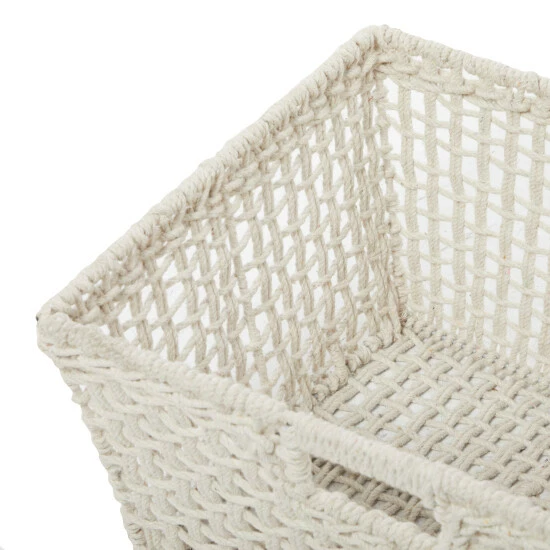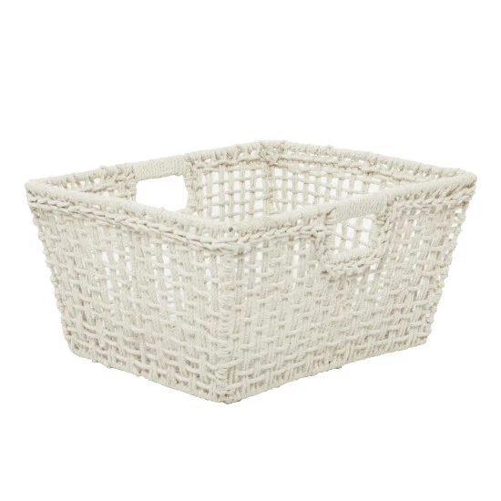 Organize and store your belongings with this woven storage basket for a charming and convenient addition to your bedroom or living room spaces. Keep your space tidy and neat with the help of these storage baskets. Place them by your bedside, laundry room or living room to keep your space free of clutter. This item comes shipped in one carton. Cotton rope is woven into a sturdy basket form with cut out side handles. Suitable for indoor use only. Made in India. Bohemian design.