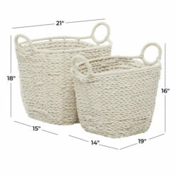 Offer any bohemian themed home a final touch by displaying this decorative basket set that can hold throws, pillows, magazine or plants. Keep your space tidy and neat with the help of these storage baskets. Place them by your bedside, laundry room or living room to keep your space free of clutter. This item comes shipped in one carton. The materials are woven together to form oval baskets with side handles. Suitable for indoor use only. Made in India. This set comes with 2 baskets. Bohemian Theme.