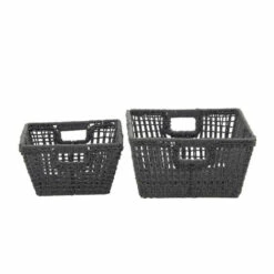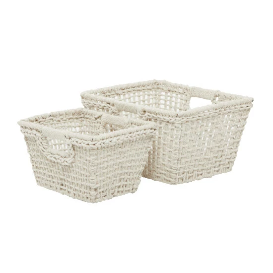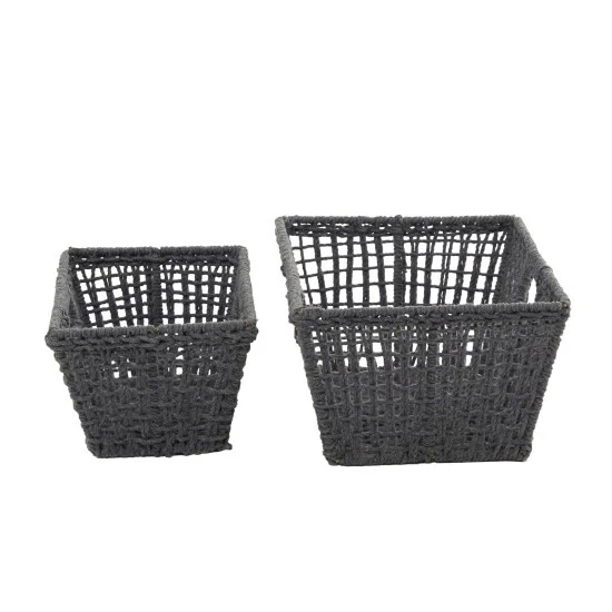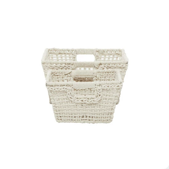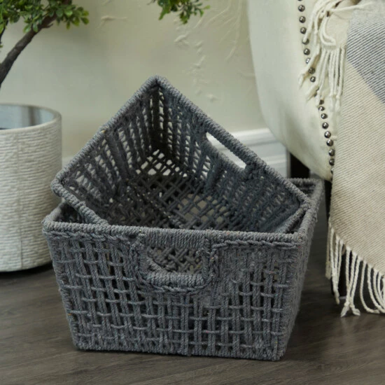 - Each basket boasts of intricate rope grid weave patterns with 2 cut out side handles for easy carry