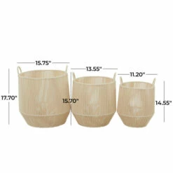 - Cotton and metal storage baskets measure 16″L x 16″W x 18″H, 14″L x 14″W x 16″H, and 11″L x 11″W x 15″H; collectively weigh 6 lbs, 14″L x 14″W x 14″H, 12″L x 12″W x 12″H, and 10″L x 10″W x 10″H; collectively weigh 4 lbs, 16″L x 11″W x 12″H, 15″L x 10″W x 11″H, and 12″L x 7″W x 10″H; collectively weigh 5 lbs and 16″L x 12″W x 11″H, 15″L x 10″W x 10″H, and 13″L x 8″W x 9″H; collectively weigh 5 lbs