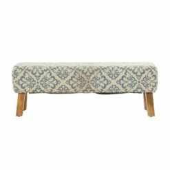 - An accent furniture featuring a cream cushioned fabric seat with blue decorative flourishes and brown 4-legged wooden base