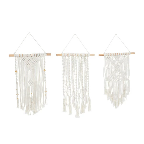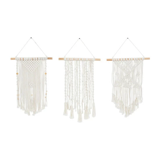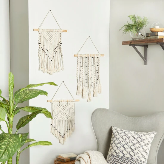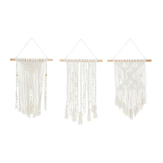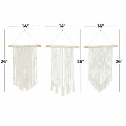 Give your home a premium look with this macramé wall decor set that will provide your walls with delicate texture. Place this on any blank wall space adding both texture and depth to your home. Create a balanced space in the most creative way with this expertly crafted wall decor for captivating focal point. This item comes shipped in one carton. Due to the handmade nature of this item, no two will be alike, there will be slight differences in shape, size, and color (Is it handmade?). Items come with sturdy threads for easy and secure hang. Suitable for indoor use only. Made in Indonesia. This set comes with 3 macramé wall decors. Country Cottage Style.. Crafted to offer any farmhouse or country cottage themed home a final touch with a rustic appeal. This macramé wall decor set features a cream finish that can complement any home decor in your space. A country cottage wall decor made of solid wood and cotton materials. These macramé wall Decors features different structures with wooden supports along with tassel and bead details. Each item measures 14″L x 1″W x 26″H, 14″L x 1″W x 26″H, 14″L x 1″W x 26″H and weighs 3 lbs