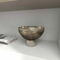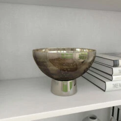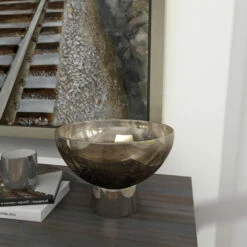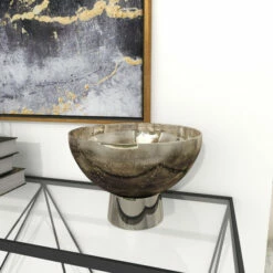 Dress up your side table, mantle or console with this decorative bowl from Studio 350. Crafted from high-quality glass and aluminum materials, it features a silver-finished, round and tapered body designed with gray-finished speckles and a solid, round base. This alluring bowl is ideal for holding sola balls, potpourri and other small items. Purchase this piece today at a price that will surely suit your budget!