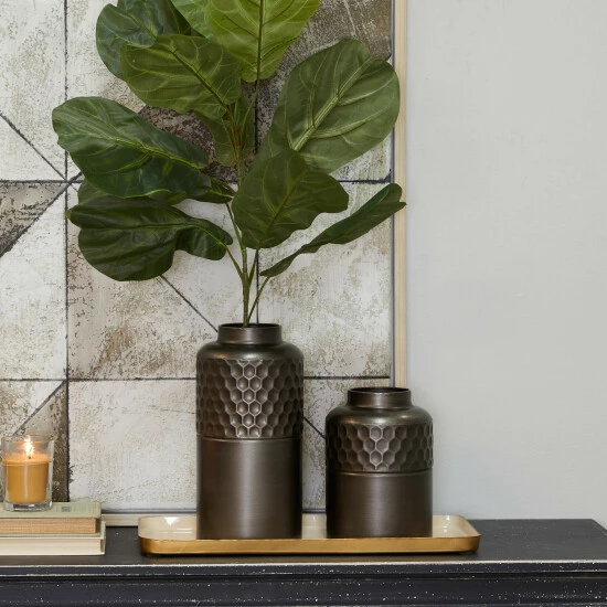 - Brushed dark gunmetal grey finish with faint sheen highlights these bud vases