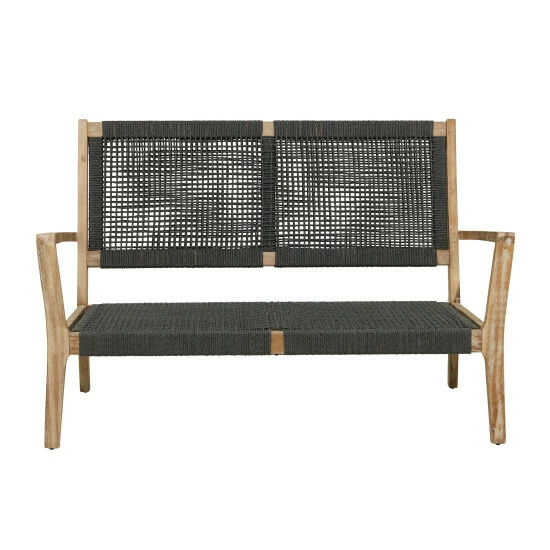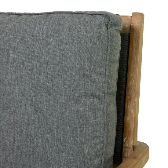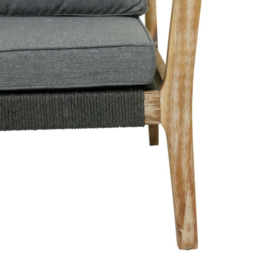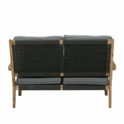 Make your outdoor patio your perfect getaway with this sleek and spacious sofa or chair. An all weather sofa or chair that will keep your home looking chic and adds an inviting element into your indoor or outdoor space. Take a breather and enjoy the beauty of nature while you spend time on your precious gardens and backyard patios with this modern wooden sofa with soft cushions. Designed with black rubber stoppers at the base that prevent scratching off floors and surfaces. This item ships in 1 carton. Wooden armchair features a dark gray seat with a 3″ cushion thickness and a 4″ back cushion thickness. The cushion cover is removable and washable with soap and water. Cushions should be stored indoors when not in use. The fabric can fade over time, turn cushions regularly to equalize the color change.. Suitable for indoor and outdoor use. Some assembly required. Outdoor sofa chair has a 450 lbs weight limit. Made in Vietnam. Use water with a simple cleaning solution on the wooden legs and wipe dirt off with a soft cloth, rag or paper towels.. This chair can accommodate 2 people. Contemporary design. Wood, fabric and rope are exceptionally durable and are all resistant to water.