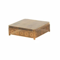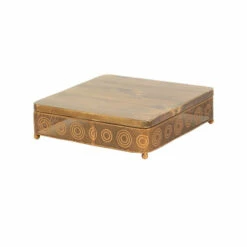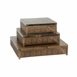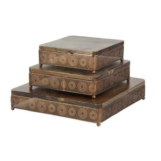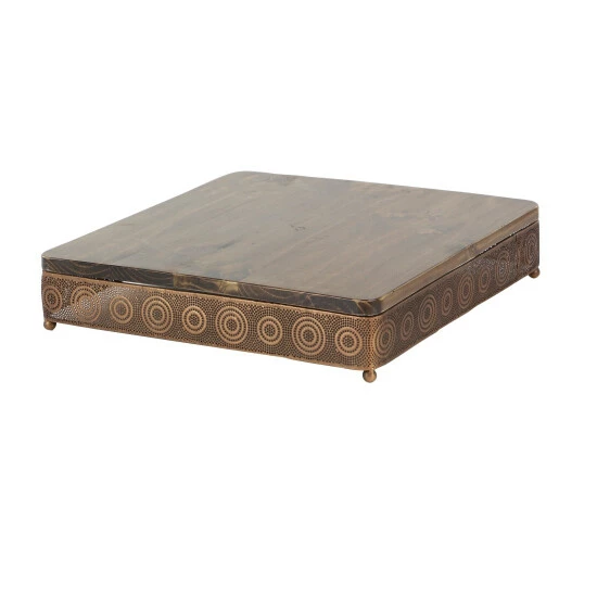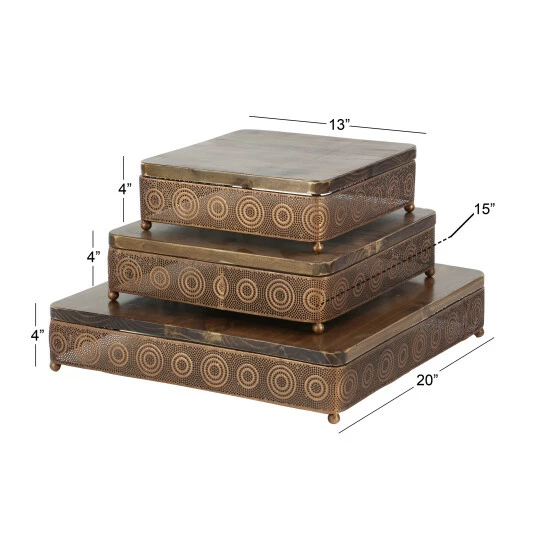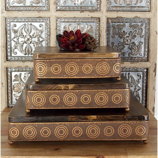 - Set of three 13″, 15″ and 20″ New Traditional metal and wood tray, features square fir wood trays, smooth and stained top, copper-finished thick iron bands, floral details with iron feet