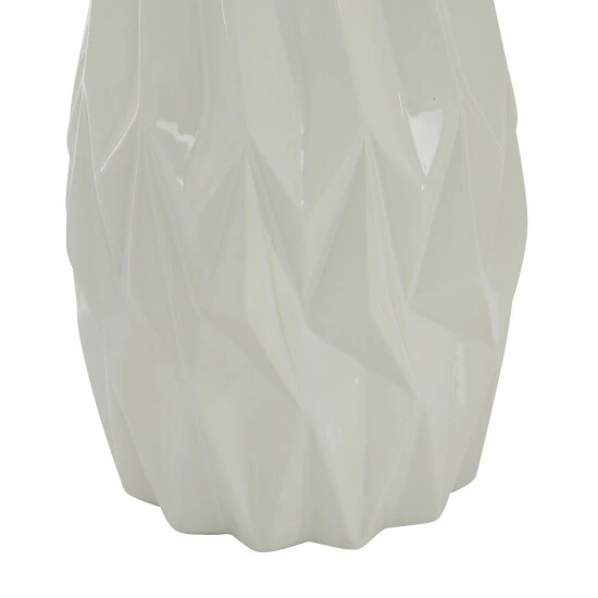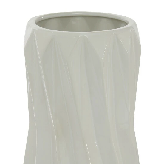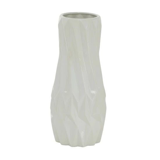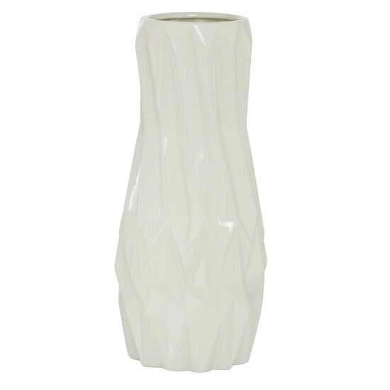 This tall white ceramic vase features a glossy finish and geometric carvings. It works as a flower vase, a decor holder, and a tabletop exhibit, offering both style and function to simple modern interiors. Its shaft is wide at the bottom and curves towards the opening. It measures 7″W X 16″H and is best used as a stand-alone decor or with faux flowers and botanical. Suitable for indoor use only. Vase does not have drain holes. Vase measures 4″ mouth openings. This item comes shipped in one carton.