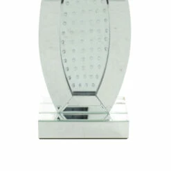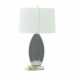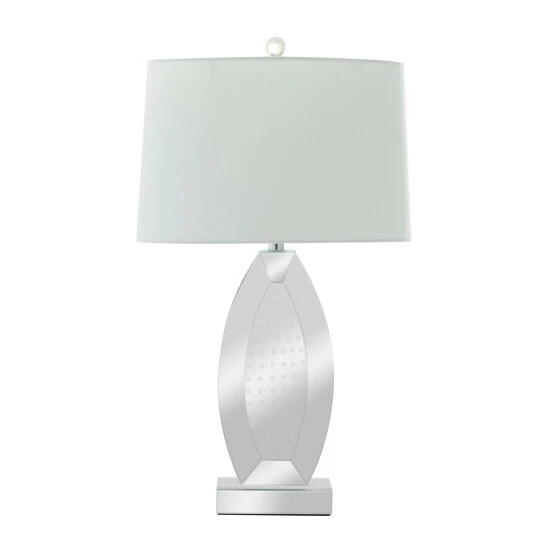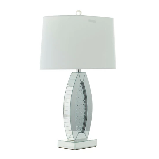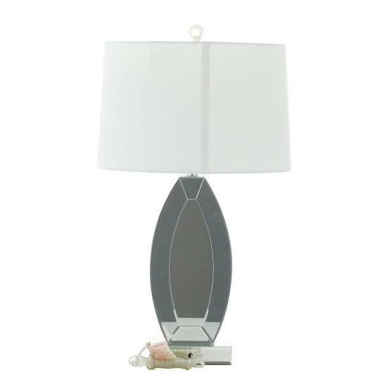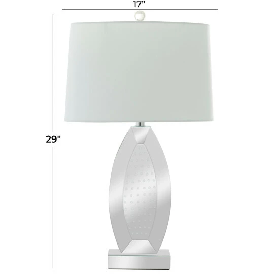Illuminate your glam space with this striking silver table lamp. The mirrored, marquise-shaped body is accented with crystals and topped with a white linen drum shade. Pair this piece with a single type A bulb to complete the look.
