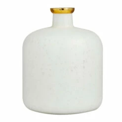 - A white decorative vase featuring a wide round body with smooth coating and narrow mouth opening with gold rim